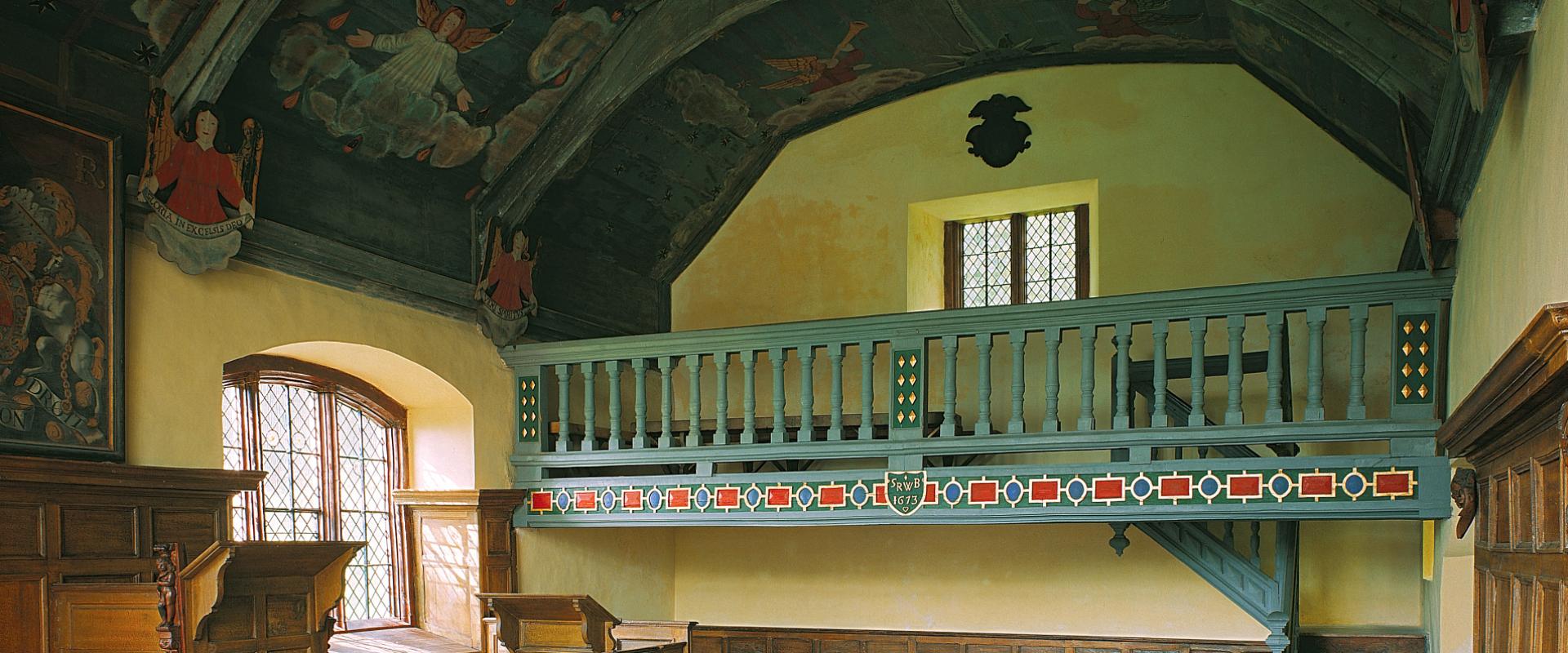 Dechreuwyd gwaith adeiladu’r capel ym 1673, ac mae tu allan carreg syml y capel yn rhoi camargraff o’r tu mewn. Lle moethus ydyw sy’n cyfuno steiliau Gothig a Dadeni, gyda phulpud wedi’i addurno â ffigurau cerfiedig.