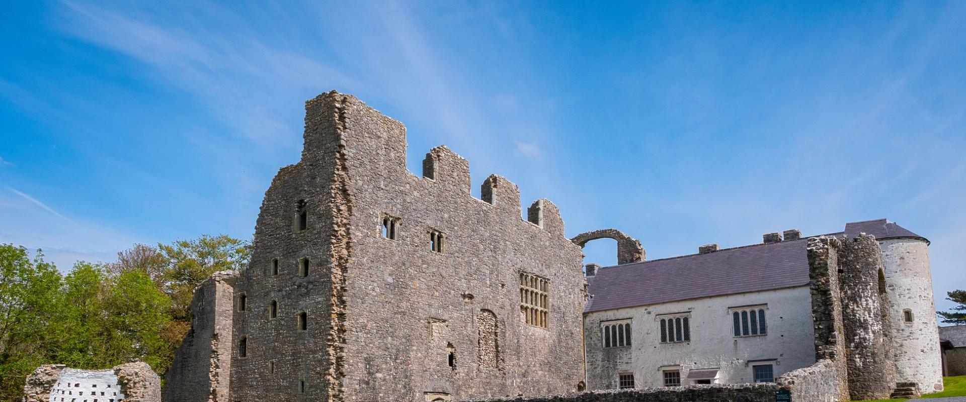 Mae adain ddeheuol gymharol blaen Syr Rice, a ddefnyddiwyd yn ddiweddarach yn ffermdy tan 1954, yn gyflawn o hyd. Ond adfail bellach yw adain ddeheuol afradlon ei fab Edward, a’i neuadd ddeulawr a galeri hir urddasol yn meddu golygfeydd rhyfeddol o’r môr.